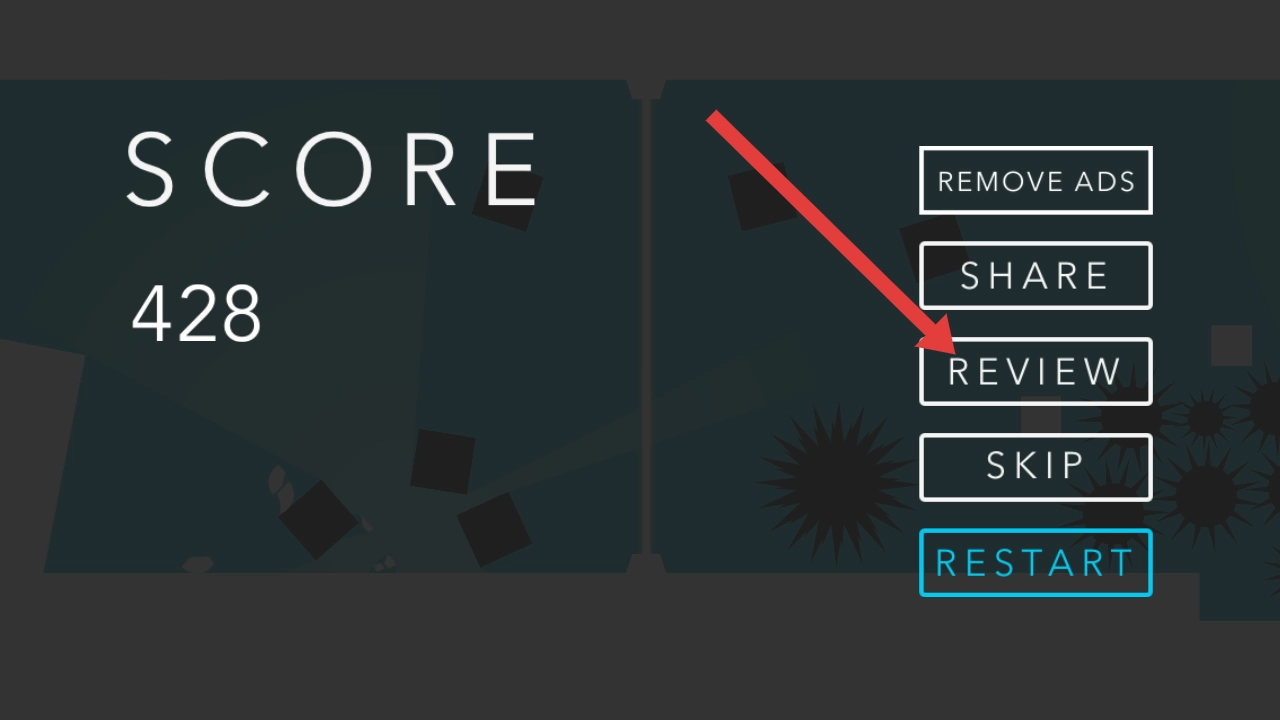 3、完成关卡挑战后,结算界面会显示得分和完成情况,此时点击箭头指向的【REVIEW】按钮,可进入游戏回顾界面。