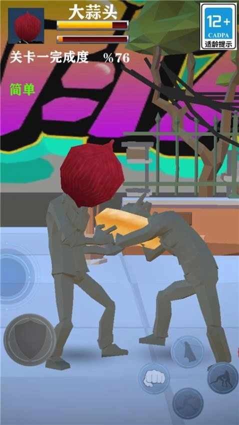 3、场景互动是取胜关键,要善用环境中的特殊道具,如接住飞来的平底锅可获得一次强力反击机会,踩到香蕉皮会触发滑稽的滑倒动画。