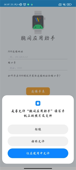 1、并安装腕间应用助手在手机上,打开软件,授予软件读取文件权限(这步很重要);
