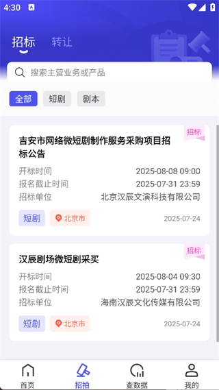 2. 在首页即可看到短剧剧本招标信息,可以通过搜索功能,搜索更多产品和业务;