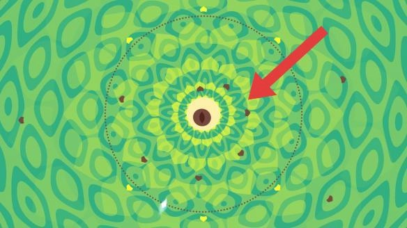 3、到后半阶段,继续控制白色的物体绕中心眼球旋转,还需要沿着虚线轨迹收集周围棕色的小点。