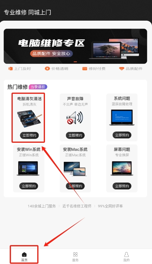 2、登录成功后,页面会自动跳转到首页,在显眼位置找到 “电脑清洁预约” 选项并点击。
