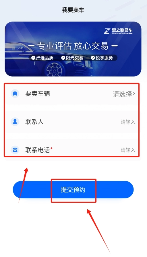 3、成功登录回到首页,找到醒目的 “我要卖车” 选项并点击,接着如实填好车辆、联系人及联系电话,填完点击提交预约。