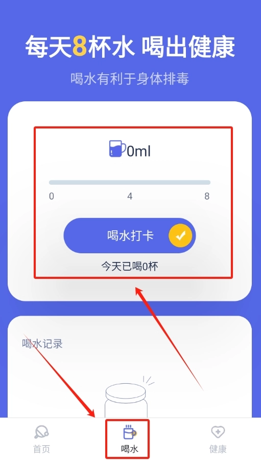 2、找到喝水记录功能,点击就能记录自己每天的喝水情况。
