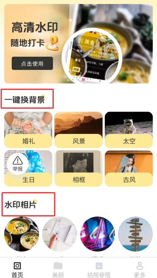 1. 启动之后,点击“智能拍摄”,可选择背景替换模式或者水印模式,同时支持对时间、地点等水印信息进行自定义设置。
