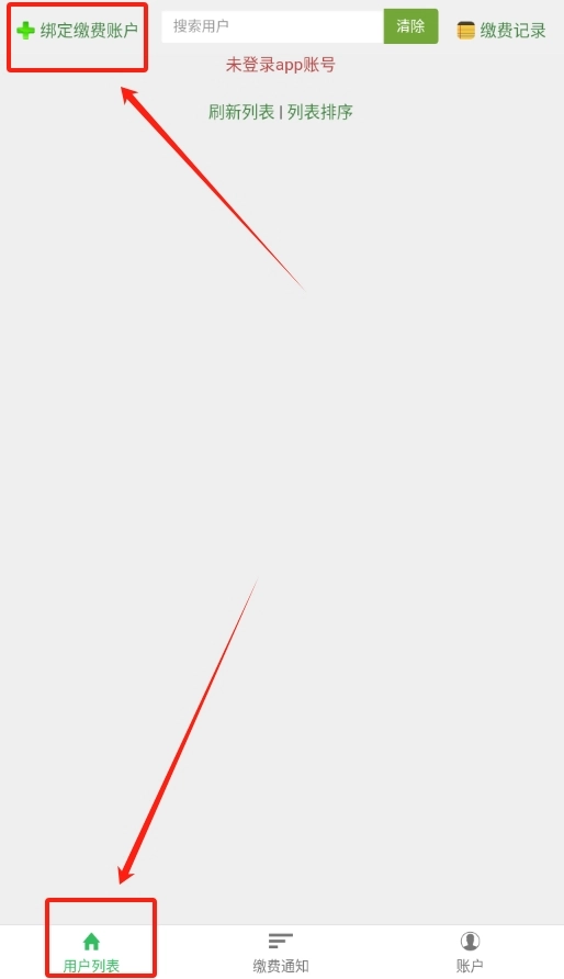2、登录后返回软件首页,点击左上角的绑定入口,准备进行缴费账号绑定。