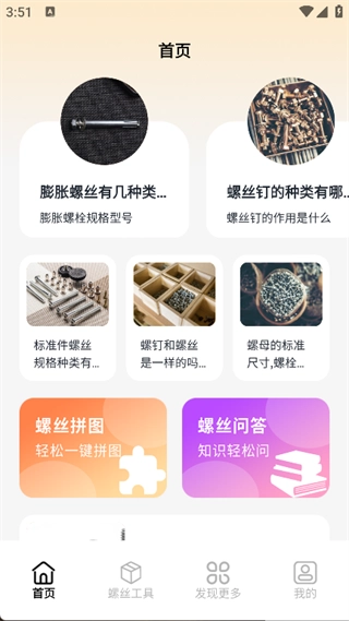 2. 在首页即可看到各类螺丝科普,还有螺丝拼图和螺丝问答功能;