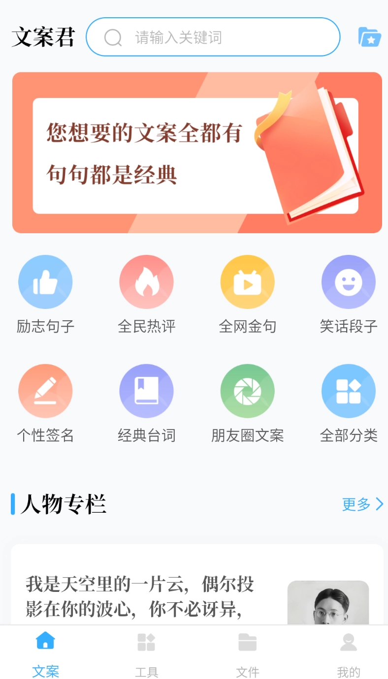 1. 多元资源聚合:文案君汇聚经典影视台词、励志心灵话语、朋友圈热门文案以及全网流行金句,用心打造多场景内容应用库。