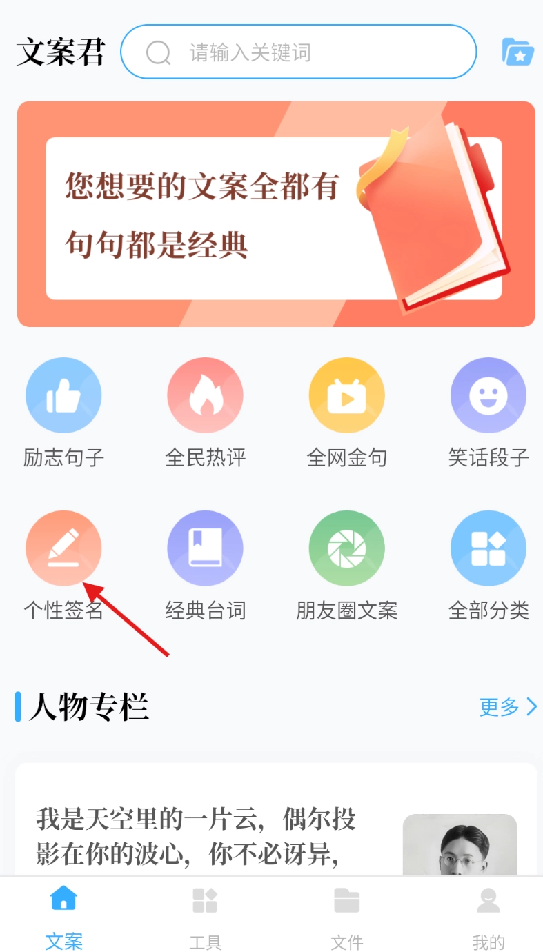 1、安装获取:打开手机应用商店,搜索 “文案君” 并完成安装,点击图标进入软件主界面。