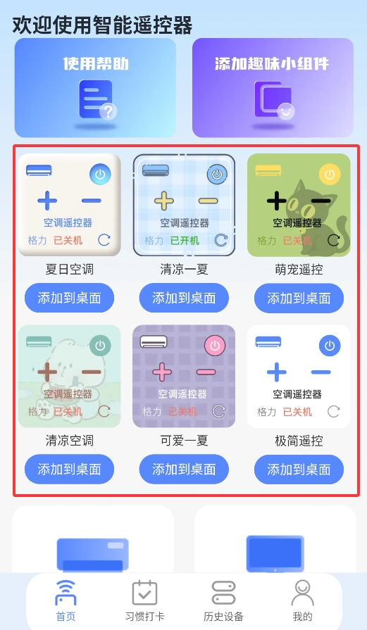1. 启动之后,于主题中心挑选心仪的遥控器皮肤(像卡通、极简风格之类),一键将其设为桌面快捷控件。