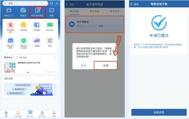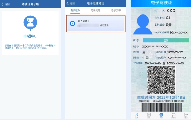 登录“交管12123” → 首页 → 电子证件凭证 → 电子证件 → 电子驾驶证 → 申领 → 提交申请 → 通过审核即为申领成功。