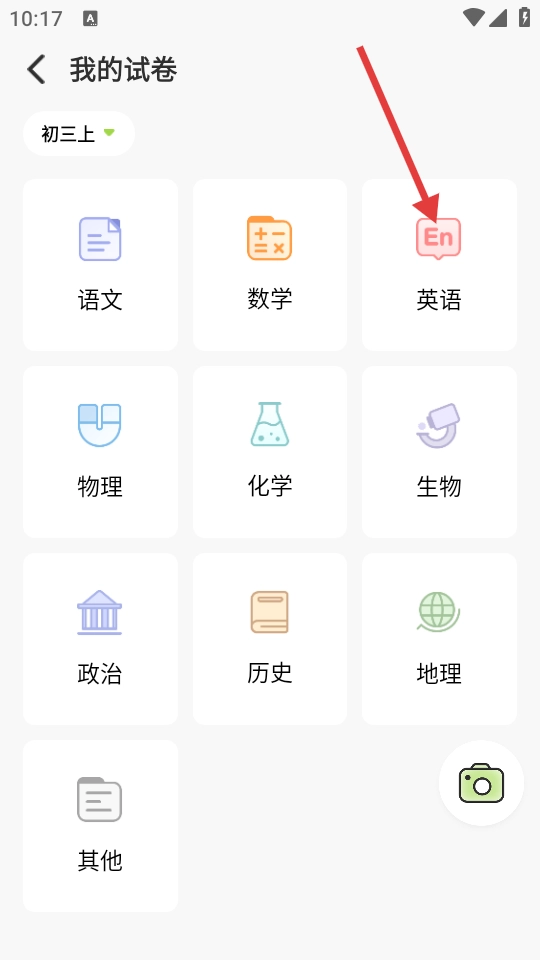 4、进入英语学科页,点击【上传试卷】,上传初三上英语试卷,完善学习资料存档。