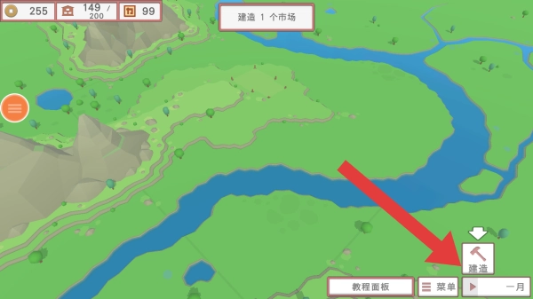 2、画面呈现建设任务(建造1个市场)及操作按钮(建造、菜单等),玩家需在古代中国背景下进行城市建设与管理,此为模拟经营类玩法场景。