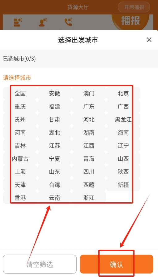 3、选好出发和目的地城市后,检查一遍信息没错,直接点击确认就能开始找货源。