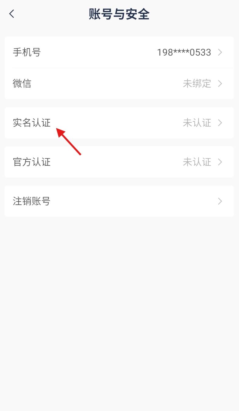 4、在账号与安全页面点击 “实名认证”,进入身份信息填写界面。