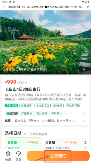 3、在产品列表中,找到长白山4日3晚自由行条目¥999起/人,宿万达智选假日酒店,点击进入产品详情页。
