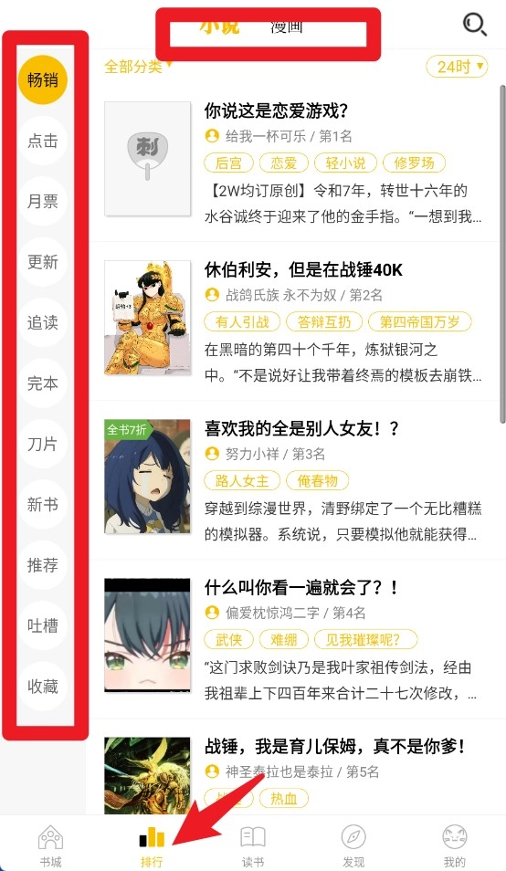 2、排行榜页面设有点击、月票、追读等分类榜单,帮助用户快速发现当前热门小说作品。