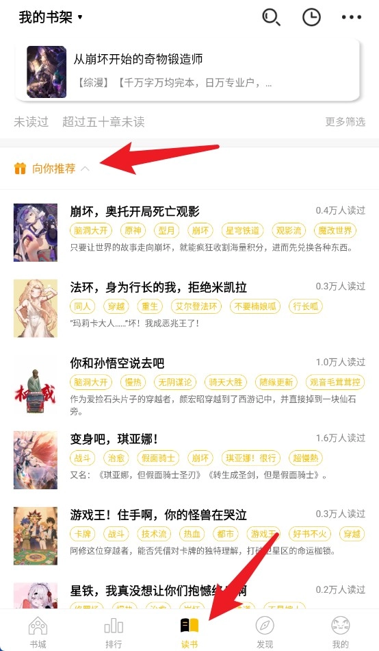 2、回到首页,可以在“读书”页面找到加入书架的内容。