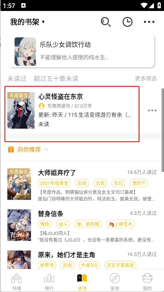 3、读书页汇集用户书架与个性推荐,系统根据阅读记录推荐更多你可能喜欢的优质内容。