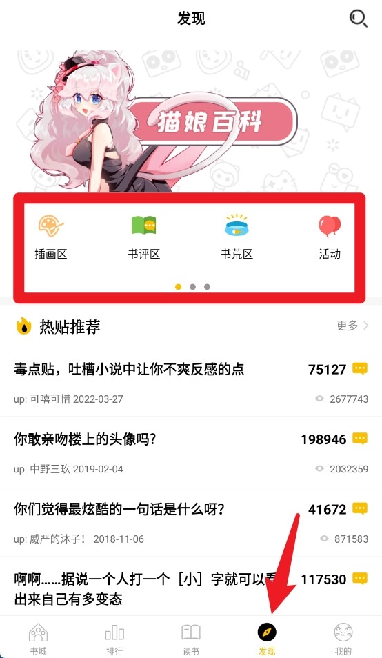 4、发现区整合插画、书评、书荒与活动专区,是用户互动交流和发现新内容的重要入口。