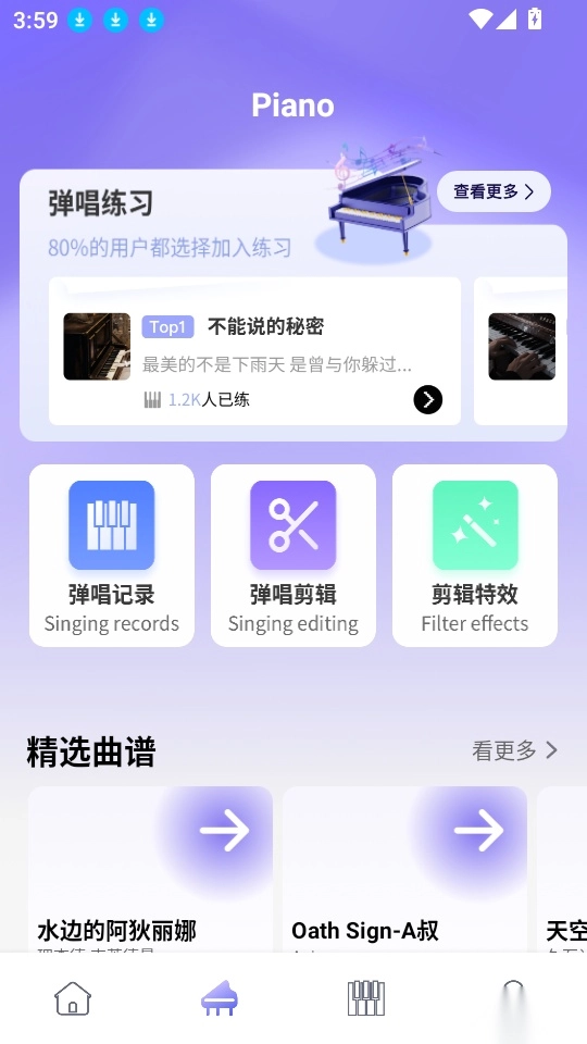 了专属的钢琴弹唱模块,可以有效锻炼用户的视唱能力,实时进行弹唱学习。