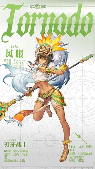 与身为大祭司继承人的星纭一同长大,她是巨木部落中最骁勇的战士,也是星纭最坚定的伙伴与战友。当整个部落的责任都落在星纭身上时,风眼决心成为星纭手中的利刃,为她斩断前路上的所有荆棘。