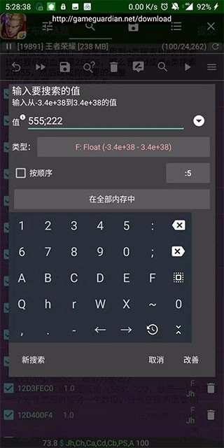 当我们需要搜索两个数据的时候,一个一个搜索起来的话数值会很多,容易奔溃,那么我们就可以用到联合搜索,比如生命值是555,攻击力是222,那么我们就在搜索面板输入555;222,就是一个数值加一个分号然后再加另一个数值,分号在搜索面板有。