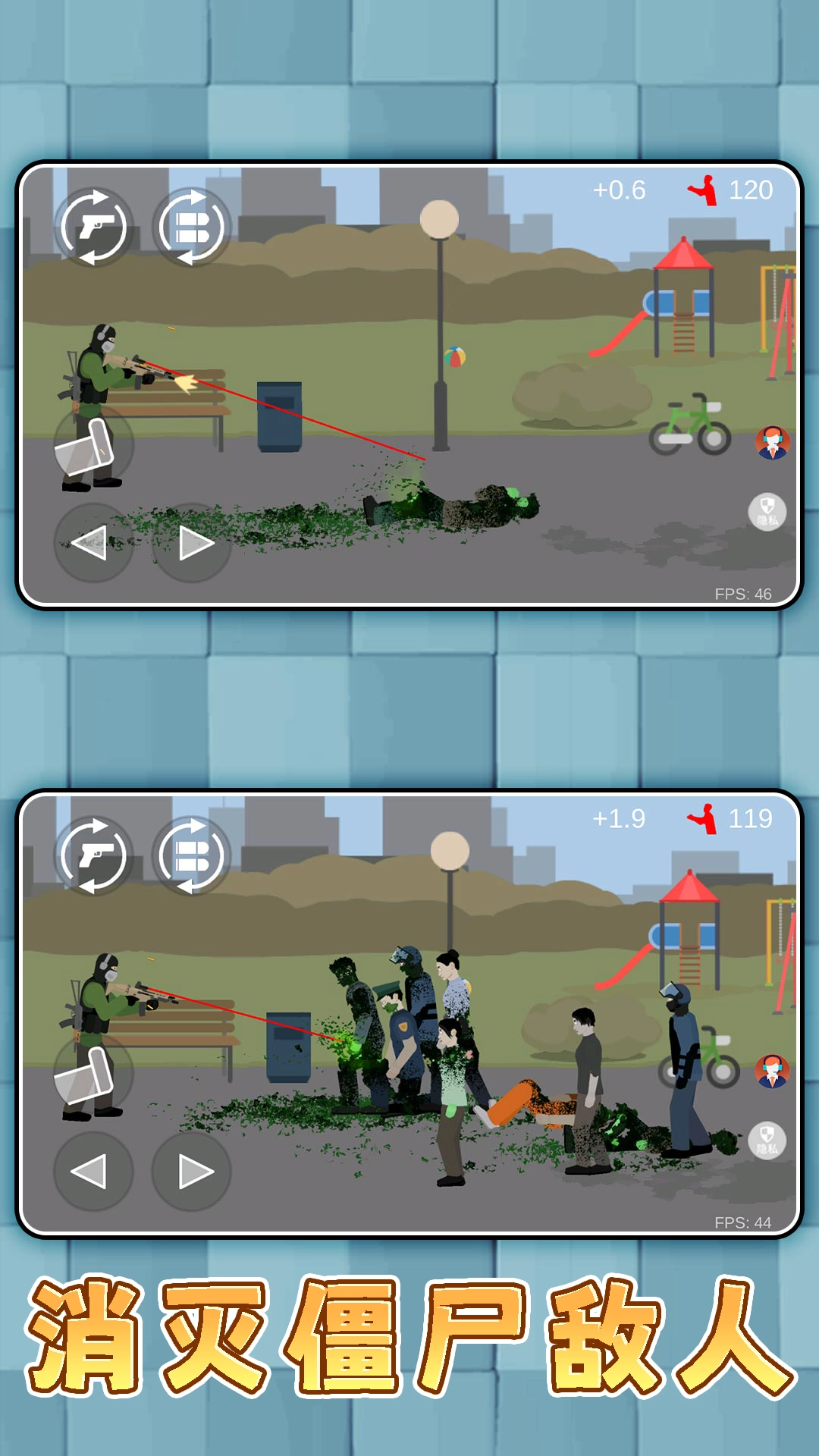 1操作方法是通过触摸屏幕进行瞄准,仅需手指滑动便可锁定僵尸,当松开手指时就完成了射击动作,而击杀效率会直接受到精准度的影响。