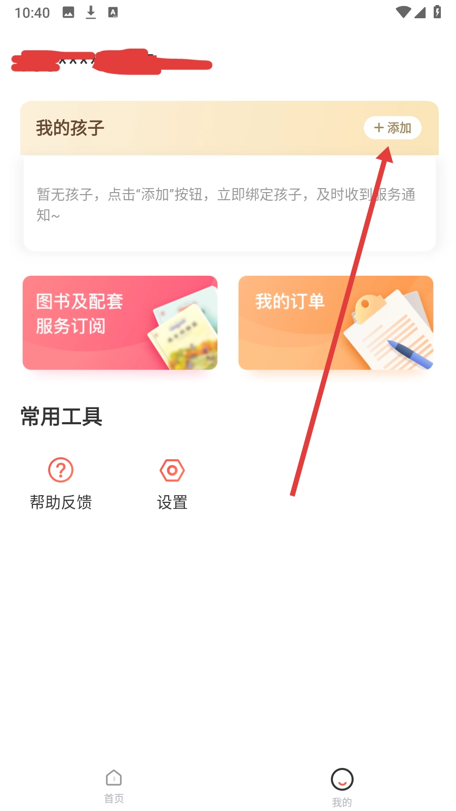 2、在个人中心点击【+添加】,开始绑定孩子信息。