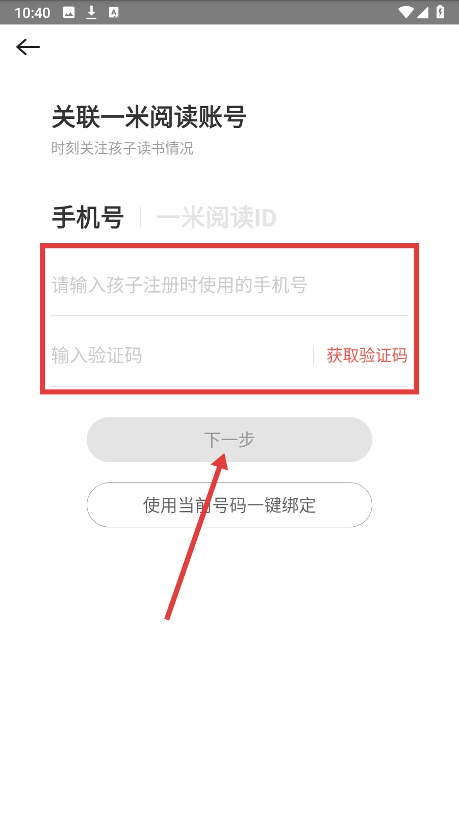 4、填孩子手机号与验证码后,点击【下一步】即可继续完成绑定。