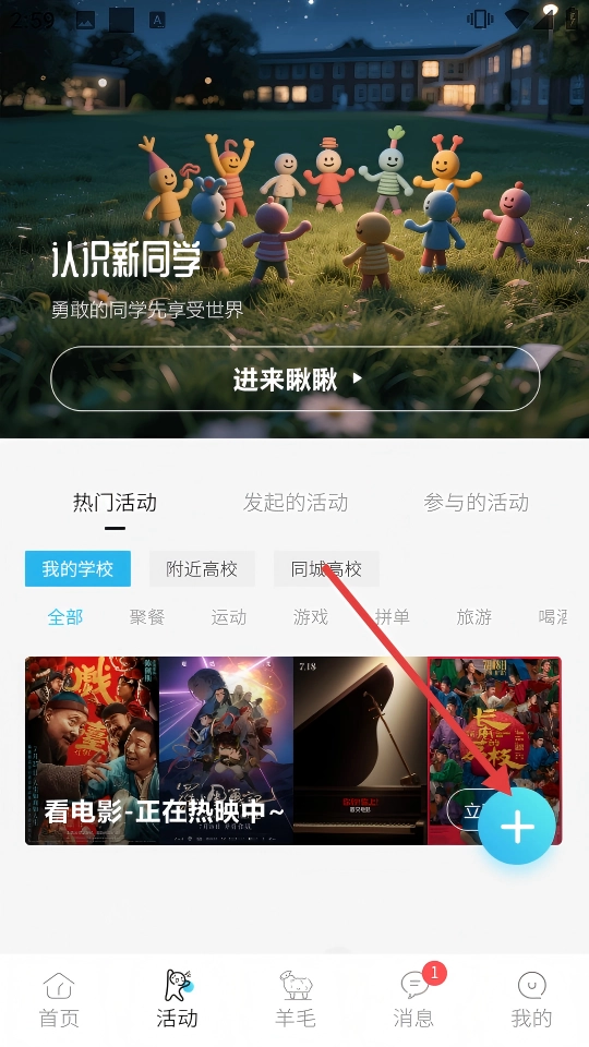 1. 点击底部的【活动】入口,就能浏览【本校-同城高校】的活动。
