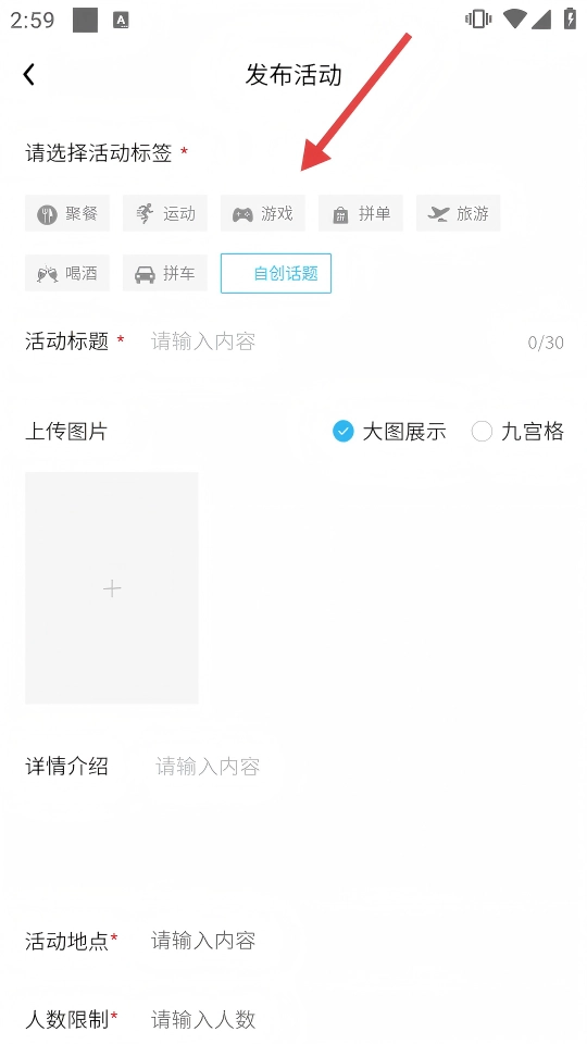 4、发布活动先选【活动标签】,再填【标题-地点-人数】等必填项,完善信息即可发布。