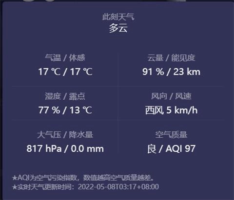 在观星指数下方,可以查看实况天气,而实况天气最后一项就是空气污染情况。