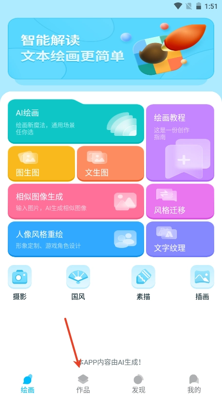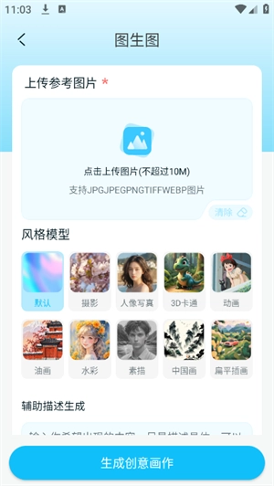 4、点击AI绘画,输入想要的画面,选择喜欢的创意风格等,点击生成创意画作即可