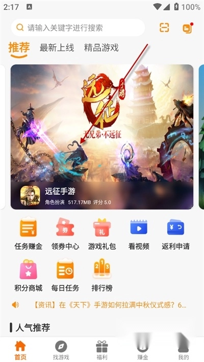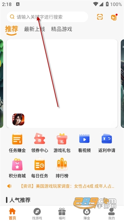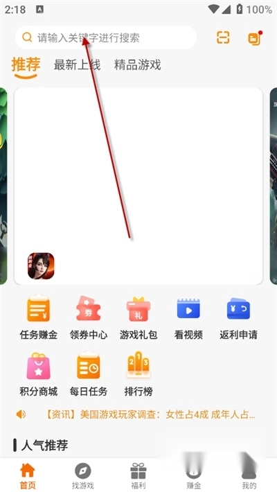 主页上方的搜索框可以搜索你想玩的游戏