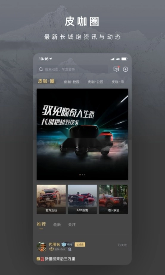 长城炮是一款为长城皮卡车主用户提供线上多元优质服务及互动交流的平台,通过融入“社交”、“越野”、“游戏”、“智能”四大元素,为用户提供全方位多场景的使用体验。
