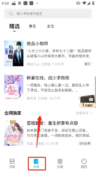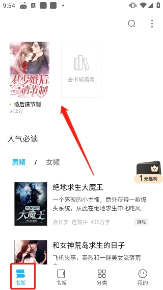 1、点击下图所示位置进入“书城”,我们可在此找到各种类型的优质小说