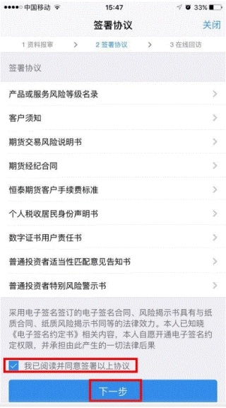 14、协议签署:阅读并签署相关开户协议(请依次点开文件才能保证操作成功),并勾选“我已阅读并同意签署以上协议”。