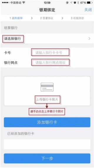 8、填写结算银行:输入银行卡号和银行网点,并上传银行卡照片,点击“添加银行卡”。