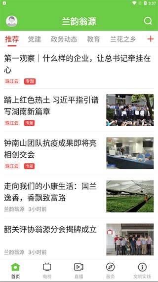 2、登入之后会看到首页、电视、直播、服务、文明实践五个板块,其中在首页中有着推荐、党建、政务动态、教育、兰花之乡、民生、文明实践、乡村振兴等多个方面的新闻资讯: