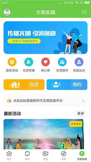 6、文明实践具备服务活动、志愿招募、微心愿、志愿团体、实践站点、社区、我的、最新活动等功能。