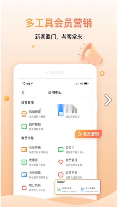 1.聚合收款支持主流支付方式;多种收款终端,各种收钱的场景都可满足;极速对账满足多种对账需求;微信支付吸粉快速累积公众号粉丝,进行分析营销。2.客流锁定可覆盖全业态的会员体系;可深度定制的会员卡及权益;基于微信生态,提供原生会员卡,小程序会员权益,给消费者极致的用户体验(出示微信付款码即可享受会员权益)。
