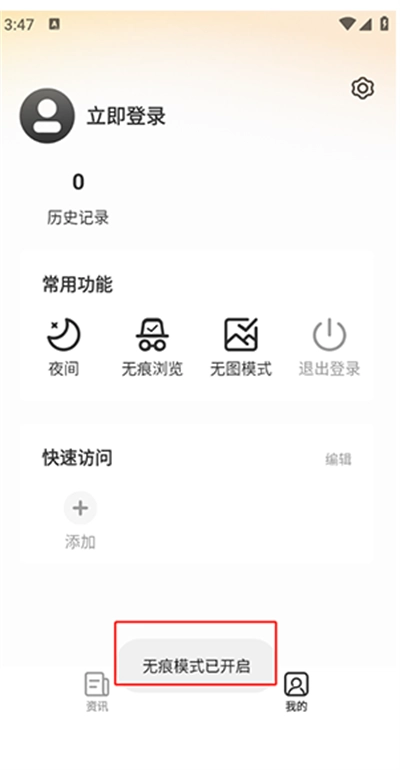 3、提示“无痕模式已开启”就可以了,之后将是无痕搜索。