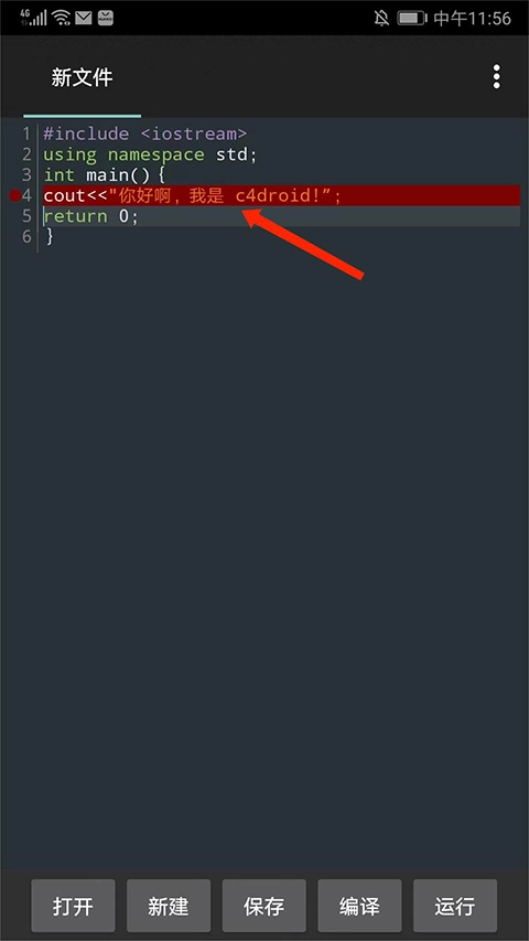2、然后打开c4droid,进行测试代码,将代码输入或者复制到输入框中,