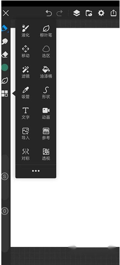 2.选择一个合适的尺寸后,我们就进入到绘画的界面啦,画世界pro中的工具都是排列在左侧和上方的工具栏中,左侧的是一些常用工具,比如笔刷、油漆桶、柳叶笔、滤镜等等,每个工具都很实用,新手朋友可以自己把这些功能都试一遍,熟悉熟悉。