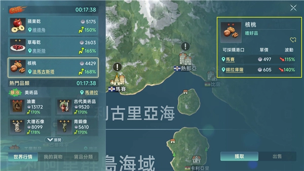 世界流行行情固定时间刷新,卖出流行商品可赚取大量海币,透过「货品分类」找到目标交易品当前最便宜的进货港,还能大幅降低进货成本。
