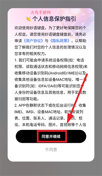 在个人信息保护指引提示界面点击同意并继续