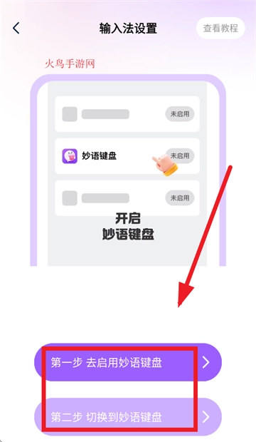 然后设置输入法,第一步去启用妙语键盘,第二步切换到妙语键盘即可