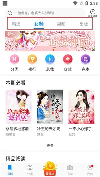 1. 打开洋葱小说免费阅读软件的主界面,在这里能够挑选精选、女频、男频或出版类小说进行阅读,此外还有本期必看、精品畅读等内容可供选择。