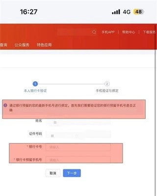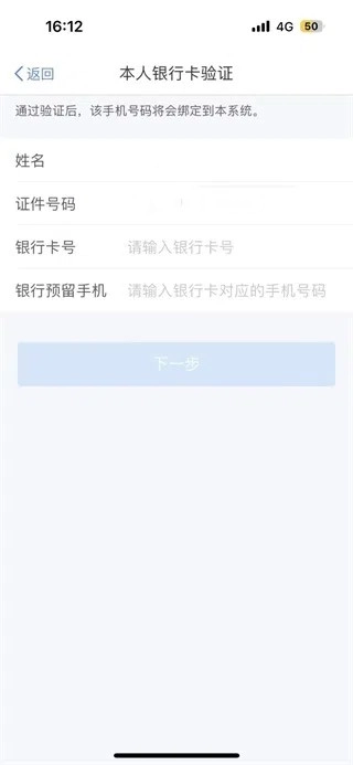 3、在页面对话框输入本人银行卡及在银行预留的新手机号码即可完成验证。